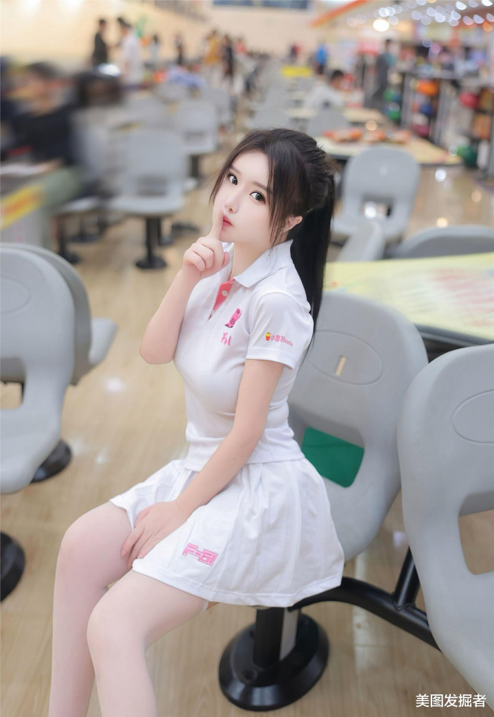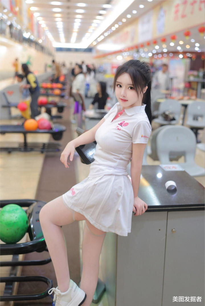 4. 场景融合:环境与穿搭的互动美学 保龄球馆的明亮灯光与彩色球体为背景,小薯条的白色穿搭在色彩对比下更显纯粹。她或倚靠球桌,或端坐椅上,姿态自然不做作,将服装的舒适与体态的自信展现得淋漓尽致。无论是站立时挺拔的身姿,还是坐下时双腿的优雅并拢,都透露出她对身材的自信掌控——这或许就是穿搭与气质相辅相成的最好诠释。